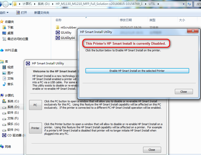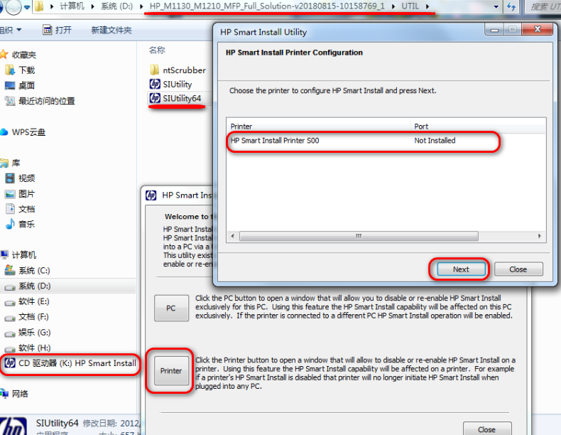 1、在HP智能安装驱动器或者下载的安装包解压后找到UTIL\SIUtility64.exe 文件打开,选择打印机后点击Next;
