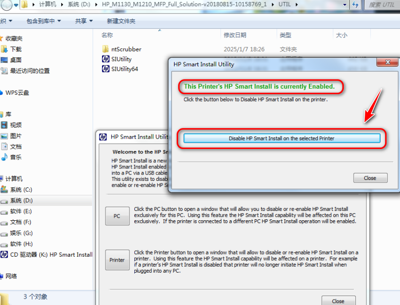 3、点击PC或者Printer选择打印机后,会显示当前是否已经打开智能安装(This Printer's HP Smart Install-is currently Enabled.),点击Disable HP Smart Install on the selected Printer;