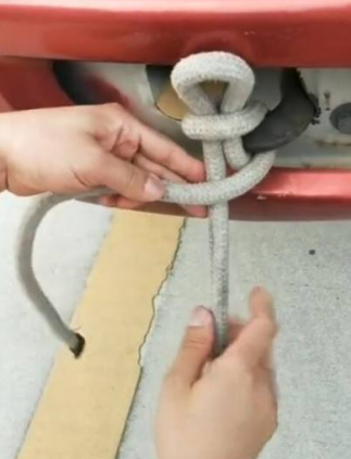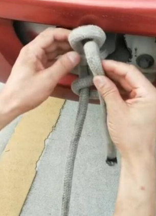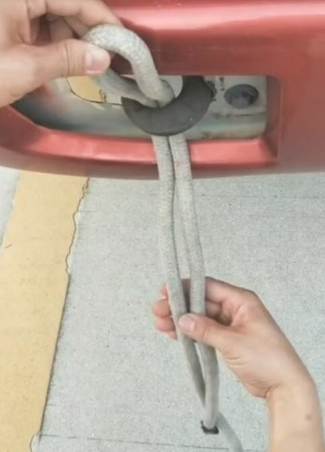 首先准备一根较粗点的绳子,将绳子对折。然后绳子自上往下穿回来,将底下的绳子翻到上面来。