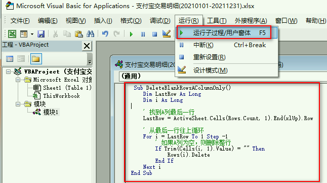 DeleteBlankRowsAColumnOnly→ 点击 运行